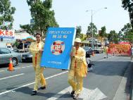 在市中心的多曼国王公园(Kings Domain)里,一年一度的由维省皇家汽车协会赞助举办的澳洲日节日盛会也吸引了众多的市民。由于大法弟子们去年的出色表现,今年该主办单位再次主动邀请我们参加,并特意给了我们很大一块场地以便我们进行功法表演。大法弟子们的资料桌、真相展板、书法表演和功法表演一直都吸引着过往群众的目光,许多人当场学功、了解和咨询大法真相,与大法结下了善缘。