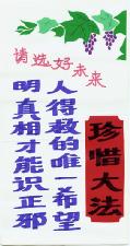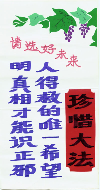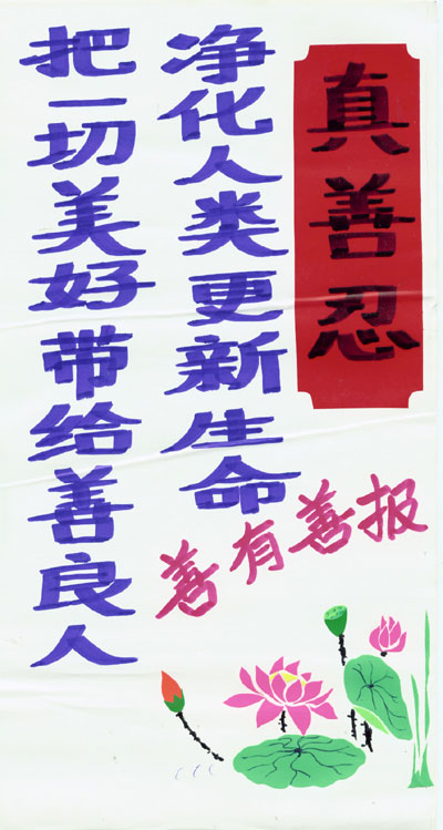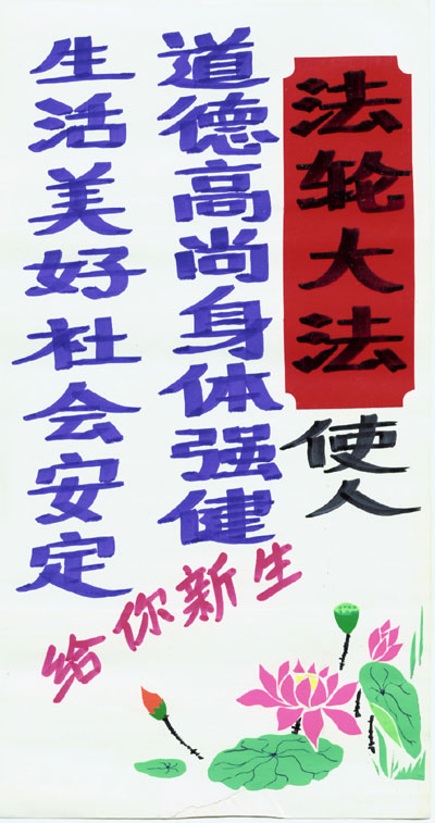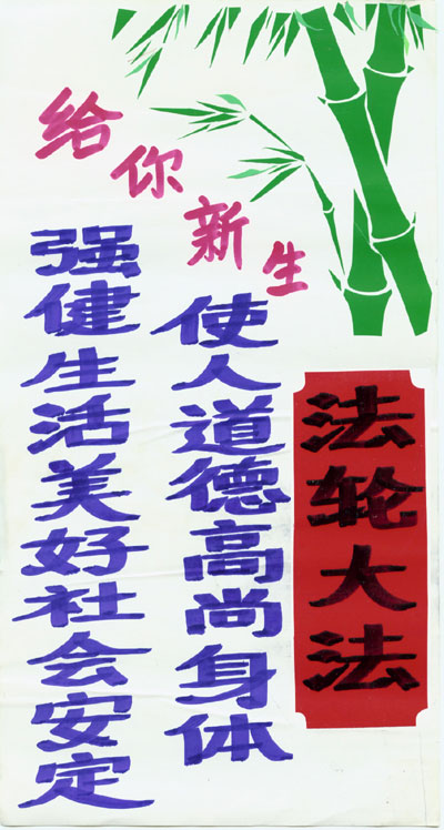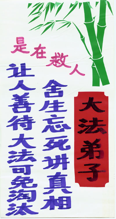 【明慧网2003年1月29日】北方农村大法弟子手工制作的讲真相资料,这些资料是在当地环境条件所限的情况下制作出来的。农村的大法弟子在不干胶上书写大法标语,并将莲花、竹子、花草等点缀其上,展现着大法的美好与殊胜,而这些莲花、竹子、花草都是一点点、一条条剪好之后再贴上去的。大法弟子将自己制作的真相资料广泛张贴,受到当地百姓的普遍赞扬。
