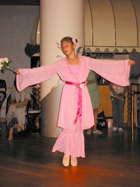 文艺表演之前,昆省法轮大法发言人首先向宾客们简单介绍了法轮大法在昆省的发展情况,并重点介绍了修炼法轮大法的巨大裨益。接下来,一位11岁的来自中国的男孩子为大家演奏了两首二胡独奏曲,悠扬的乐曲,沁人心脾。第二个节目是两名黎巴嫩大法学员用中文演唱歌曲“法轮大法好”。 他们姐弟二人音韵谐和,吐字清晰,不看相貌真会以为是中国人在演唱呢。客人们余兴未尽,就又被另一个美妙的场景吸引住了。演出台上出现了三位仙女,她们身着淡绿色的纱裙,随着大法弟子谱写的乐曲翩翩起舞,真是美极了。