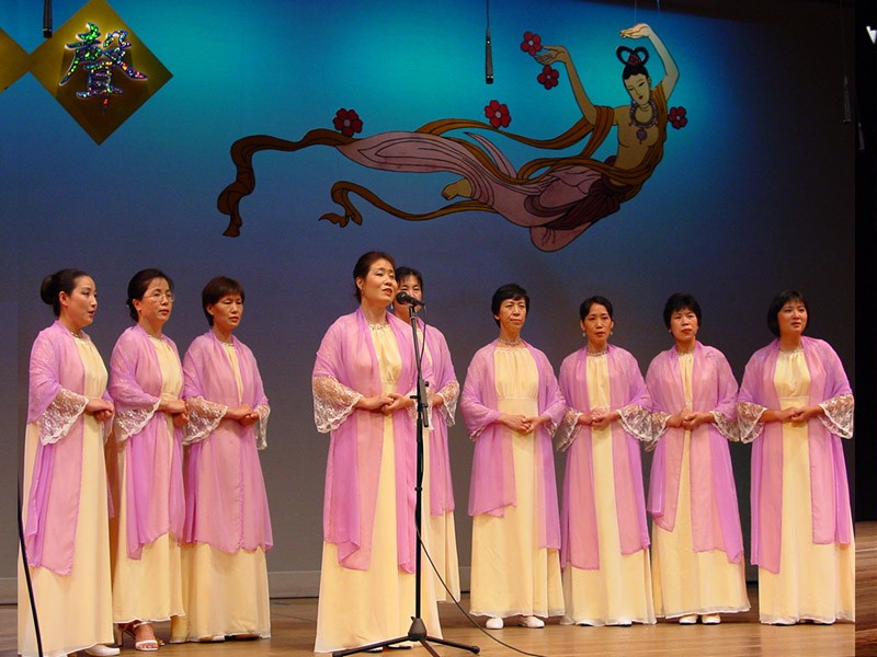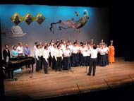 器乐合奏一曲“春天”,以磅礴的气势,拉开了晚会的序幕。精彩的文艺表演,博得全场观众的阵阵热烈掌声。尤其是来自墨尔本的于2001年10月曾去过天安门广场和平请愿的西人夫妻法轮功学员,以二重唱形式西人中唱“为你而来”时,使观众无不感动,掌声迭起。最后“同颂音乐艺术团”全体演员,和法轮功之友会参演人员组成的40人大合唱“法轮大法好”,将文艺晚会再次推向高潮,演出在“法轮大法好、法轮大法是正法,佛光普照”歌声中圆满结束。