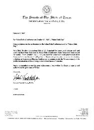 作为代表德州26选区的参议员,我表彰德州及世界各地的法轮大法学员们所做出的诸多贡献及努力。2003年10月10日至12日期间,来自德州及世界各地约2000多名法轮功学员将汇聚休斯顿参加一系列的活动,其中包括心得交流会和庆祝法轮功传入美国7周年等活动。