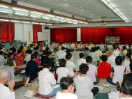 下午二点发完正念后,法会正式开始,来自香港、台湾和塞班岛弟子共聚一堂。法会现场布置得很庄严,处处可见塞班岛弟子的用心,尤其法会上挂的横幅,是当地弟子们一针一线亲手制作的。塞班岛弟子的发言,没有任何掩饰,体现出的纯真,使每个香港学员受益良多。