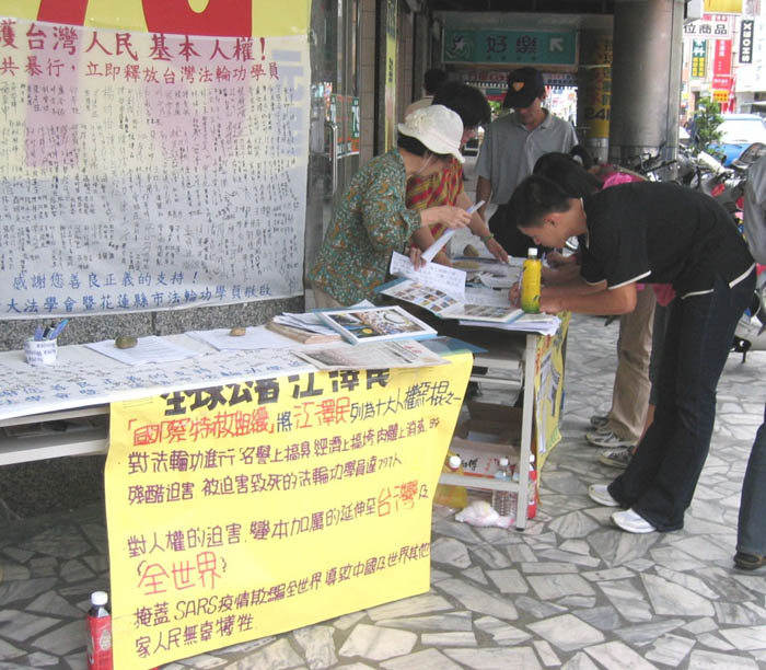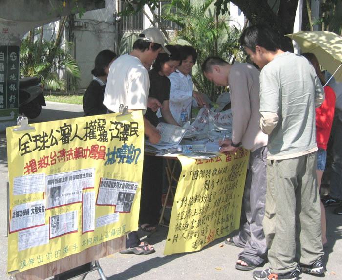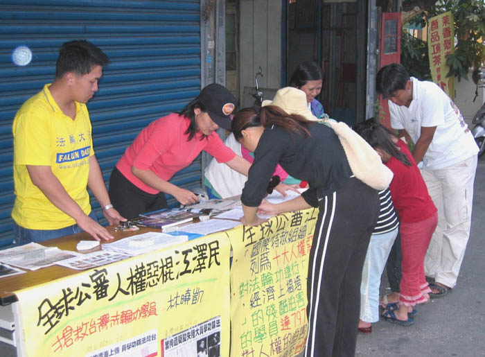 的真相及台湾法轮功学员受迫害的事实,身在自由社会的台湾民众听了之后,皆讶异于江氏独裁政府的暴行,无法相信现代社会还有这样对人民的残酷迫害,均踊跃签名支持全球公审江泽民的活动,及希望台湾法轮功学员林晓凯早日归来。