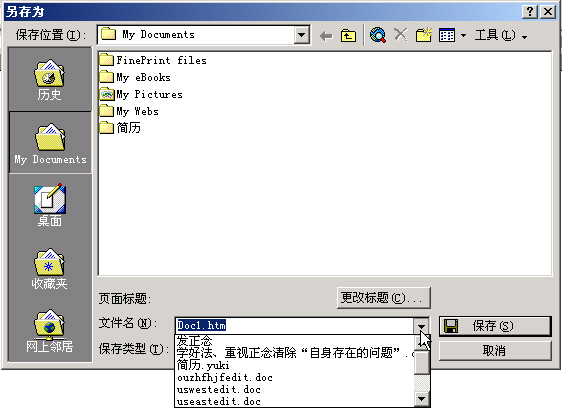 在word中使用“另存为...”和“另存为...web页”菜单后,会留下另存的文件名称(见附图),而这个历史记录尚无软件可以清除,通常人们都没有注意到这个记录,我使用word已多年,却根本没有注意到此点,一个学员问我才发现。我研究后也不知道此文件名称记录存放在何处,既不在文件中也不在注册表中。现在有一个解决办法就是,多另存为几次,覆盖掉文件记录,共有10条记录。当然,如果没有使用敏感文件名就不用清除了。