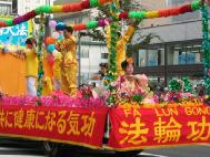 下午两点多游行开始,法轮功队伍排在第37位出场。当我们的队伍一亮相,立刻引起了观众的注意。特别是“普度”音乐一响起,更是抓住了观众的心,喧闹的街道一片寂静。花车上的“法轮大法”“真善忍”的展板引人注目,天女散花队让人心旷神怡,活泼欢快的秧歌队让人们振奋,唐装队典雅华贵,轻柔舒缓的舞蹈和学员们祥和沉静的气质使人们仿佛进入仙境。游行会场的广播里简要向观众介绍着法轮功的情况。在唐装队伍翩翩起舞时,播音员还充满激情地说,“京都市民恐怕是第一次看到这样美丽的服装和表演,让我们以热烈的掌声欢迎他们。”学员们在表演时街道两旁不时有掌声响起,观众们不住地赞叹“真美呀”“太好了”,表演结束退场时,人们还不住地和我们挥手,有的拉着穿唐装的女学员合影留念。