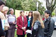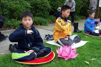 | 戴志珍女士在接受记者采访 | 小弟子端坐莲花之中 | 小法度与明慧学校的学生一起在“和平的花瓣”旗帜前炼功 |