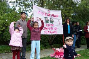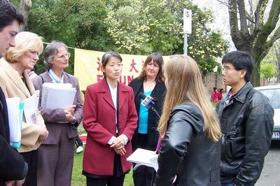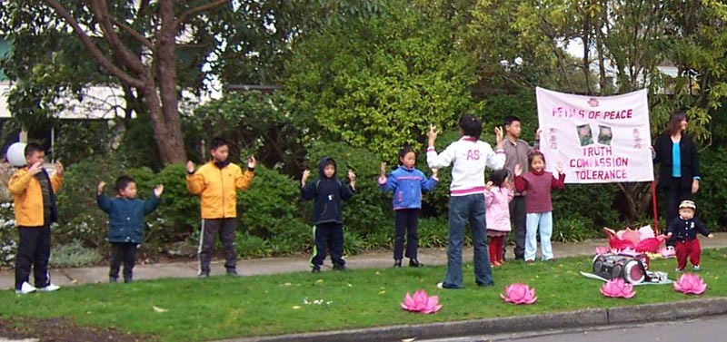 10月3日,“和平的花瓣”在墨尔本中领馆前举行了新闻发布会,明慧小学的学生进行了现场功法表演,多家媒体到场采访。