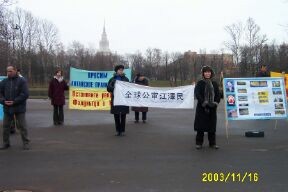 法轮大法学员,呼吁制止中国使领馆在俄罗斯散布谣言和对法轮大法的污蔑,支持全球公审江泽民。电视台记者在现场进行了录像和采访。许多过往的莫斯科人都关切地同大法学员们交谈,对中国江氏一伙对法轮功学员的人权的践踏表示愤慨。