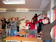 在提问的时间里,大法弟子解答了师生们进一步关心的问题。接下来,高中生们踊跃地尝试了法轮功功法。