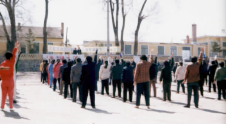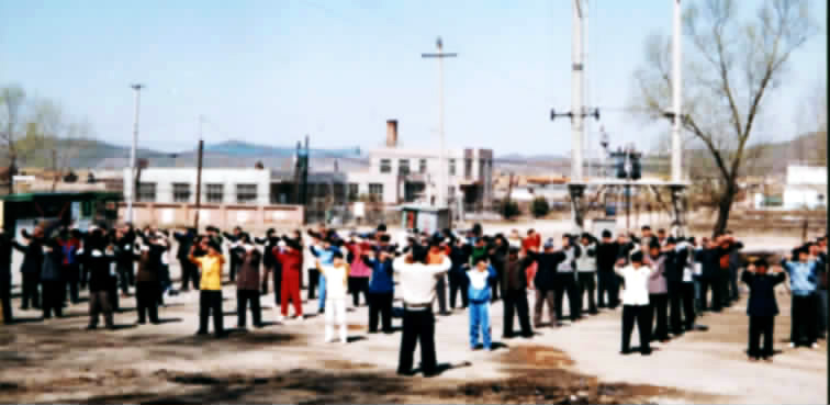 【明慧网2003年11月20日】1999年5月1日,吉林舒兰市水曲柳镇法轮功学员在水曲柳镇车站附近清晨集体炼功。
