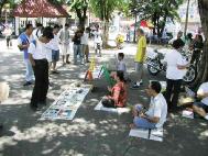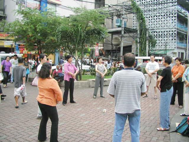 七月我们再度到菲律宾弘法,在一公园设炼功点,白天去观光景点发简介,往来的人很多,我放DVD,要学的人就马上教,吸引很多人围观。