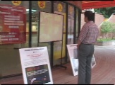 她指着画有各种酷刑的展板问:「这些是以前发生的吗?」当听到我们告诉她:「现在还在发生着,而且已经四年了。」她单纯的脸上露出不可思议的表情。她接着问:「那我可以做一点什么?或帮他们什么吗?」我们才想起忘了准备征签的表格或海报,于是告诉她明天开始我们会有征签的海报,请她经过时签名帮忙。