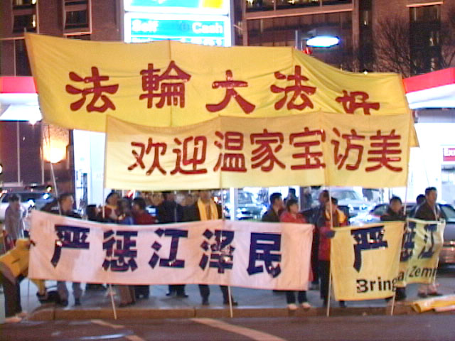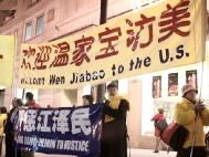 在今日全天的活动中,温家宝的车队几次从法轮功学员打出的“欢迎温家宝访美”、“严惩江泽民”、“法轮大法好”等横幅面前经过。