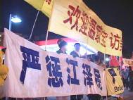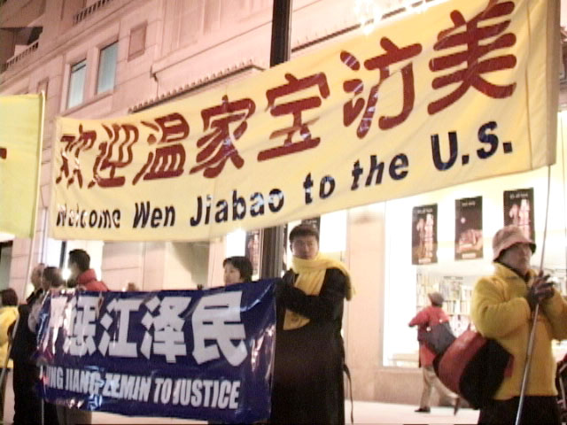一位使馆安排来欢迎的女士问来自亚特兰大的法轮功学员陈志先生:为什么不通过其它途径,而在这么大影响的场合打“欢迎温家宝访美”、“严惩江泽民”、“法轮大法好”的横幅。陈说:“许多人不了解整个过程,97、98年时,一些地方对法轮功学员的无故骚扰明显增多,许多法轮功学员写信向各级政府部门反映情况,但石沉大海,只得亲自到各级政府部门上访,又经历了一些事情,最后才到国家的最高信访机构——国务院信访办公室上访。99年7.20镇压开始,最后的上访途径也没了。”