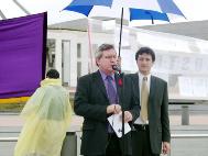 今天安德鲁-巴特利特参议员也来到现场发表演说。他说一个人的最基本的生存权利是不能够被忽视的。澳洲民主党将继续支持法轮功学员营救亲属的各种活动和要求中国政府停止这场迫害。我们的努力已经有了可喜的结果。已经有人被营救了出来并且来到了澳大利亚。我们的呼吁不仅仅是为澳洲公民的亲属也是为营救在中国受到迫害的法轮功学员,我们将和你们一起努力。