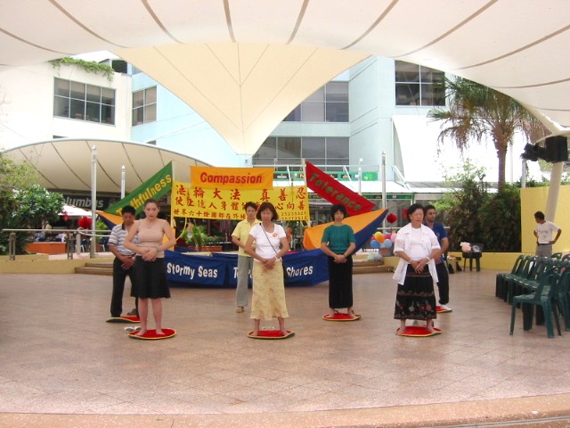 精彩的节目吸引了来自不同国度、不同文化背景的游人,一些人干脆坐下来观看,并向学员询问有关法轮功的问题。还有很多人去资料台索取资料。我们发现他们中间很多人听说过法轮功在中国遭受无理迫害一事,但对法轮功本身的了解相对来说还比较肤浅。许多在对面用餐的中国游客主动索取资料,还兴致勃勃地拍摄了很多照片、录像,准备带回国跟更多的同胞分享海外见闻。