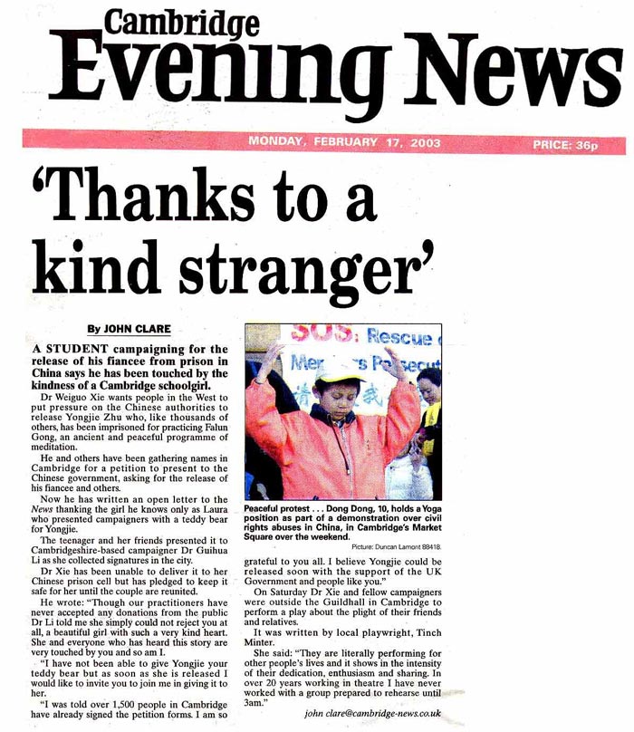 “我被告知超过1500剑桥人已在请愿书上签名。我非常感谢您们,非常感谢所有善良的剑桥人。我坚信永洁和宝莲能在英国政府和人民的帮助下释放。”
