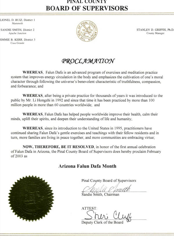 因此,现在,为庆祝亚利桑那州法轮大法首届年度庆祝节,槟诺尔(Pinal)县监事会特此宣布2003年2月为: