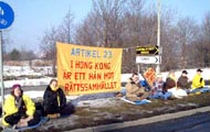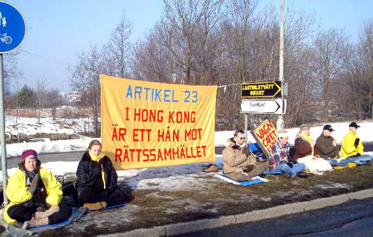 【明慧网2003年2月27日】2003年2月25日上午,瑞典哥德堡市及周围城市部分大法弟子来到中国驻哥德堡领事馆前,抗议香港在回归几年后,无视香港人民的民主自由,拟立恶法第23条。由于中国领事馆坐落在工业区,因此来往的车辆很多。司机们对中国江政府一伙