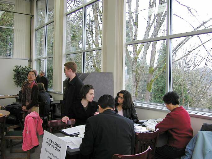 同日在“妇女俱乐部”举办的正法之路图片展吸引了不少政府机构的工作人员、州政府官员和记者。通过参观图片展,人们对大法增加了不同程度的了解。一位州议员特地跑来了解法轮功。他所代表的区域还没有大法弟子,但是他于圣诞节期间收到了西雅图地区大法弟子寄去的贺年片,上面签满了大法弟子中、英文的名字。他说,收到你们的贺卡非常荣幸,也非常喜欢“真善忍”三个字,所以今天特地来了解法轮功。学员带着该议员参观图片展, 他一边观看一边提出了许多问题。之后他品尝了学员亲手做的丰富的中国菜,并与学员交谈。