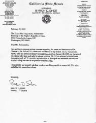 我写此信表达对查尔斯.李的被捕和拘留强烈的关注。李医生是一位美国公民,也是我选区的选民。他于2003年1月22日抵达中国广州机场后不久被捕,被指控破坏电视和广播通讯设备。而李先生已通过一位美国驻上海的领事代表坚决否认了这些指控。李先生坚信他仅仅是因为修炼法轮功而被逮捕。