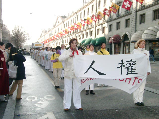 上午9点,法轮功学员和支持法轮功的人士从新广场开始游行。百余名身穿白衣的女学员,手中拿着部分被迫害致死的法轮功学员的照片和花圈,走在游行队伍的前面。整个游行队伍绵延数百米,其中有部分学员拉起了“法轮大法好”、“SOS 中国停止酷刑和虐杀”以及“江泽民迫害法轮功天理难容”等横幅。千余名法轮功学员一直平和地走过了日内瓦市的主要街道,历经2个小时,抵达万国广场,沿途吸引了许多行人的关注。