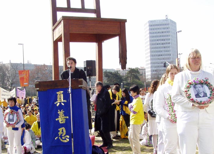 爱尔兰的研究生赵明和加拿大的张天啸两位法轮功学员也分别上台发言。赵明曾在中国受到两年劳教迫害;张天啸的姐夫在中国被迫害致死,姐姐流离失所,他们以自己的亲身经历来控诉镇压的血腥残酷。