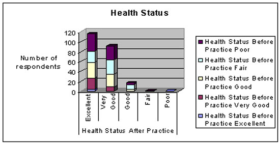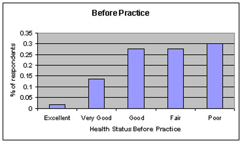 这篇健康调查报告是对235位在北美的法轮功学员的健康调查结果的总结。它显示修炼法轮功对健康非常有益。修炼后,有些修炼者的慢性疾病完全消失,有的病情显著地减轻,吸烟者戒掉了抽烟。在用统计模型(在此没有显示)处理这些数据后,其结果显示在大多数被调查者中,炼功时间越长,健康状况有更好的改善。
