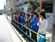 3月20日中午,学员们在市政厅前面的小广场,挂起横幅和展板,向来往的行人讲述李祥春这位善良无辜的美籍华裔法轮功学员被无理关押、并只身直面无法无天的法庭及其背后的江氏流氓极权的故事。中午进出的市政官员很多,都有幸看到真相。市长爱德华.嘎扎先生从展板前经过,和学员亲切打招呼。学员告诉他,下午要去市议会呼吁关注美籍法轮功学员被江集团迫害的事,他欣然表示欢迎。