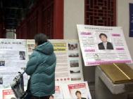 此次集会展出的有关营救李祥春、上海大法弟子林鸣立等的展板前不断有过往的中国人和当地居民驻足观看。