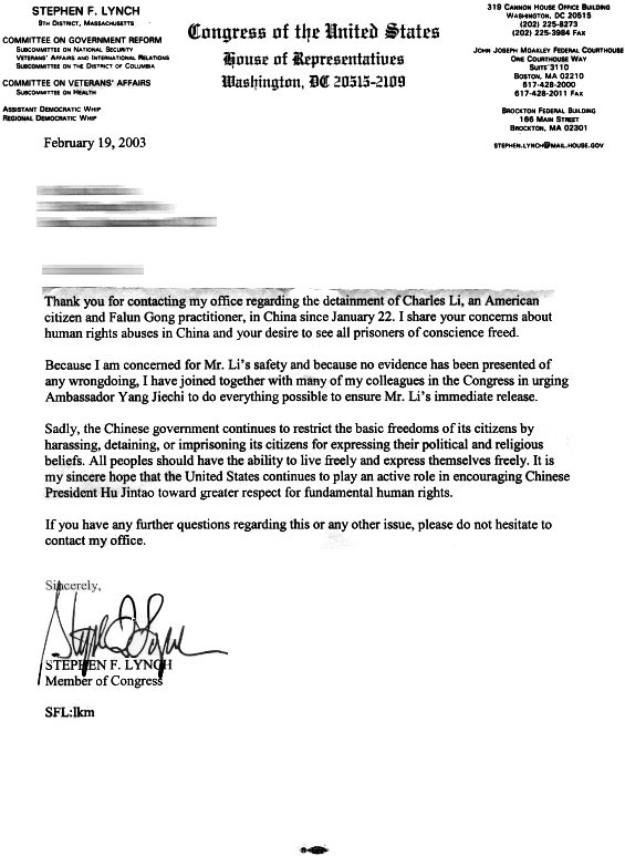 感谢您就美国公民、法轮功学员查尔斯.李自1月22日在中国被拘禁一事与我联系。我同样对中国侵犯人权的状况感到忧虑,并希望看到所有的良心犯获得释放。