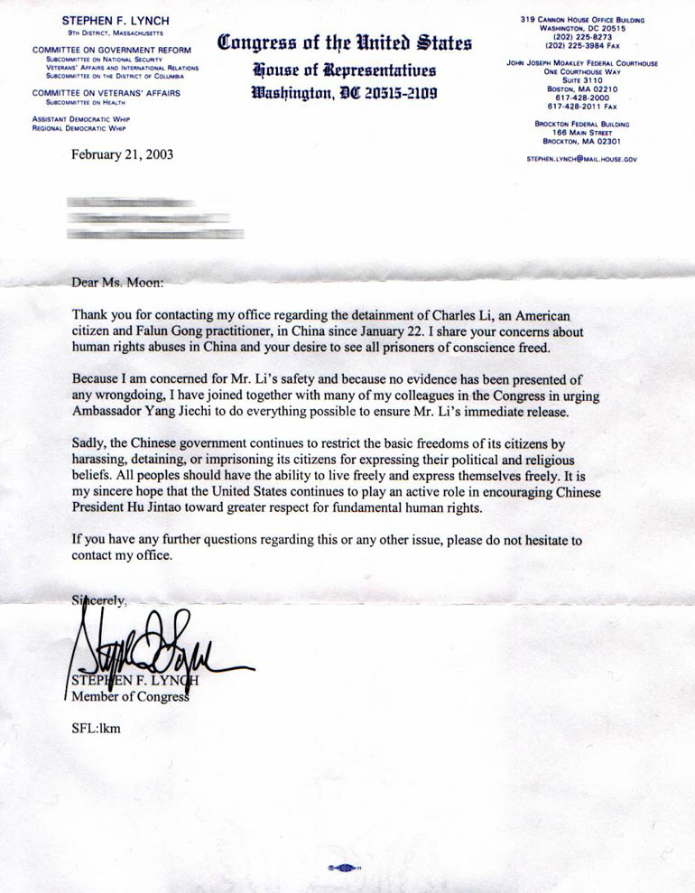 谢谢你就查尔斯·李被拘留一事与我的办公室联系。查尔斯·李是一位美国公民和法轮功修炼者。他自1月22日以来被中国拘留。象你一样,我对中国践踏人权感到忧虑并且希望所有的“良心犯”都能被释放。