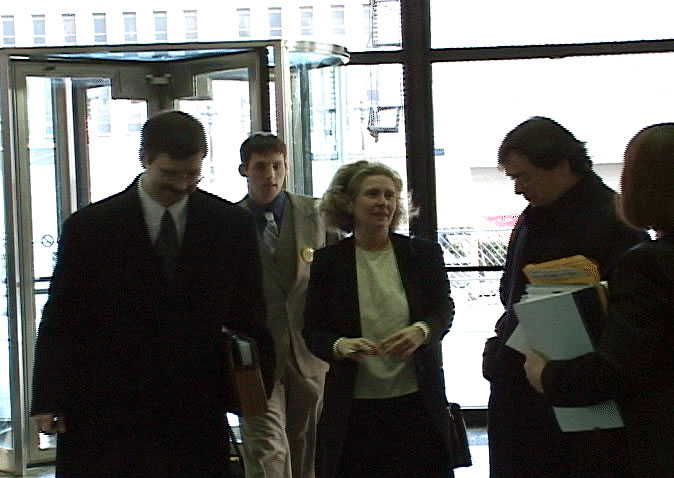 2003年1月13日中午,就受迫害的法轮功学员及亲属以群体灭绝罪(Genocide)控告江泽民一案,法庭与控方律师在美国伊利诺伊州北区联邦法院进行第一次庭上会谈研讨下一步日程。图为控方律师特瑞步入法庭。
