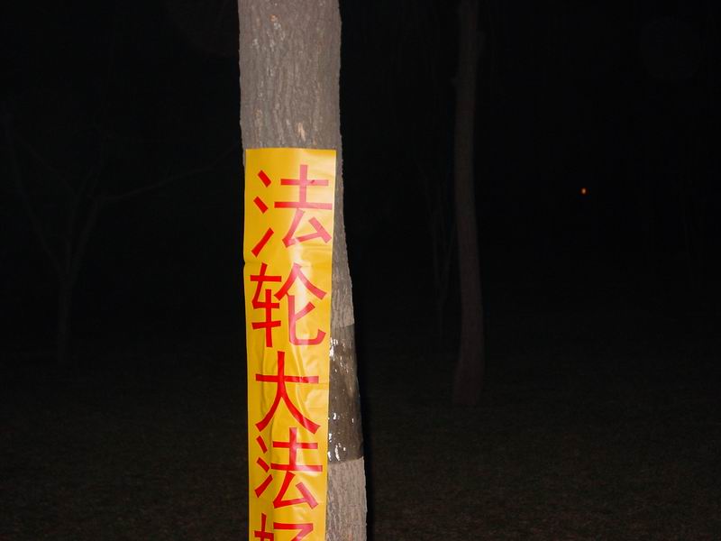 图二:在北京二环公路边上的某晨练树林里。清晨约有上百人目睹了“法轮大法好”。