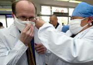 | 4月23日,世界卫生组织官员詹姆斯-马格瑞(左,James Maguire )在上海一军区医院考察。(法新社) | 4月23日上海传染病医院。(法新社) |