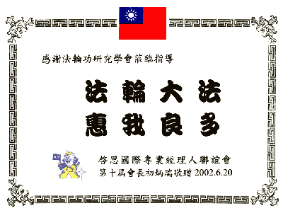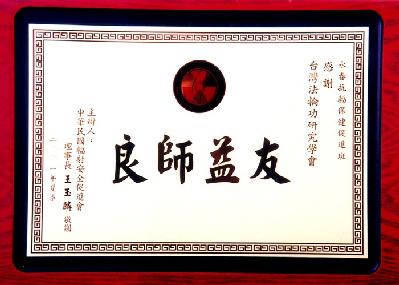 2002年12月18日,台北市癌症救援促进协会感谢状2002年12月8日,台北市新和国小感谢状2002年10月20日,2001宜兰国际童玩节感谢状2002年夏,中华民国辐射安全促进会感谢状2002年6月20日,启思国际专业经理人联谊会感谢状2001年12月29日,台北市永春国小感谢状