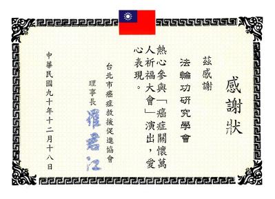 2002年12月18日,台北市癌症救援促进协会感谢状