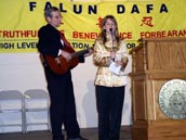 活动进行中穿插了学员们的功法表演,舒展优美的动作伴随着慈悲祥和的音乐吸引了许多人包括小朋友们聚精会神的观看。掌声中学员演唱的大法弟子创作的歌曲打动着在场观众的心。