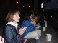 请愿活动从上午10点钟开始,学员们就坐在领馆的对面持续的发正念,夜幕降临后,他们又点燃了一个个烛灯,纪念被江氏集团迫害致死的数百名法轮功学员。请愿活动直至晚上10点钟结束。