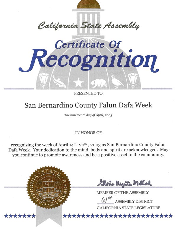 认可2003年4月13日至20日为圣-伯纳迪诺县法轮大法周,你们对心灵、身体和精神的奉献获得认可,请继续普及并为社区作积极贡献。