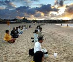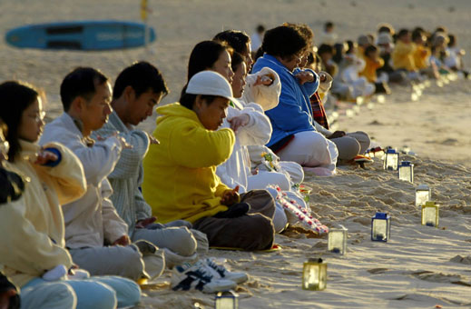 【明慧网2003年4月27日】100多名法轮功学员于2003年4月26日在晨光中打坐炼功。这个在中国被禁止但在香港仍允许的运动,抗议他们声称的中国[江氏]当局持续的镇压。这一天标志着10,000名法轮功学员为他们同修的被捕而去北京请愿事件的第四个纪念日。(David Gray 大卫-盖瑞)