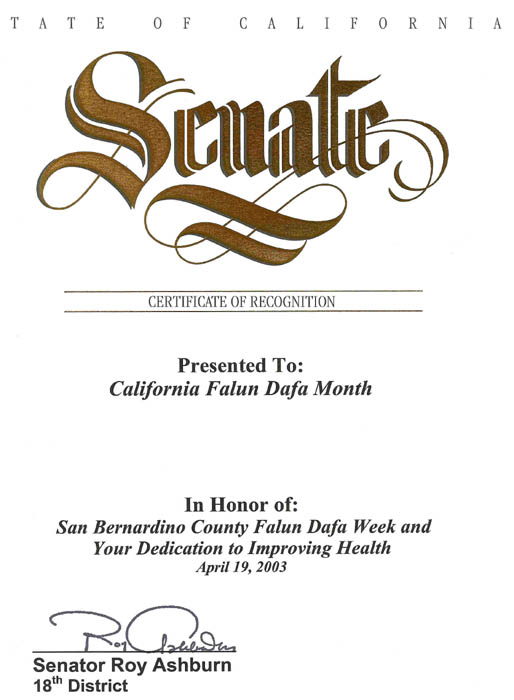 颁予:加里福尼亚“法轮大法月”