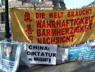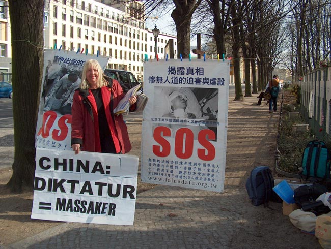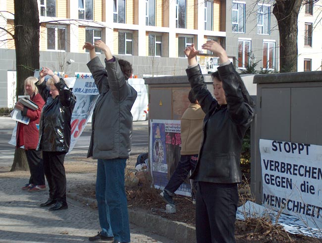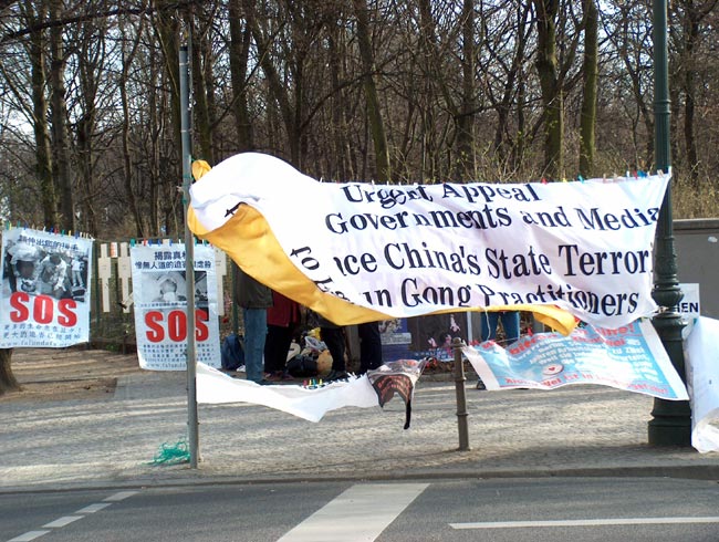 当日气候恶劣,狂风大作,学员们不为所动,坚持展示祥和的音乐和五套功法。展示的横幅无数次被狂风刮走,甚至撕裂,学员们无数次地粘补、修复,再挂上。狂风中,学员们频频发正念,每次发完正念后风就停了。中西学员们不断地向路人讲述江氏疯狂迫害善良的法轮功修炼者的事实真相,发动愿意签字的德国民众接力在熟人中征签,之后马上邮给议会主席、外长及联邦总统。柏林有很多俄国游人,俄裔大法弟子就用家乡话讲真相。