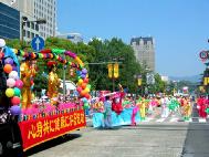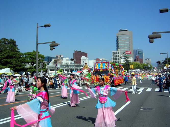 5月3日下午2时许,在巡游表演的长长的队伍中,由近200人的大法弟子组成的队伍一出场便博得市民的瞩目与欢迎。