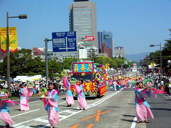 走在法轮大法队伍最后的是身着印有“真善忍”和“法轮大法”T恤衫的步行队伍,这支队伍上至七旬老人,下到坐在推车中未满周岁的娃娃,他们个个面带微笑,频频向沿路的市民挥手致意,感谢广岛市民对法轮大法队伍热情而友好的掌声。
