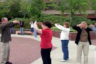 随后,学员们向公众推出了一台精彩的音乐舞蹈演出。演出在芝加哥学员的大合唱“法轮大法好”中拉开了帷幕。美中地区大法弟子在时间紧、担子重的情况下形成一个整体,充分配合,在不到一个星期的时间里就拿出了这台节目丰富多彩的演出。华裔学员们表演了中国传统的笛子独奏,扇子舞,红绸舞以及西洋器乐等节目,西方学员们则表演了声乐和键盘乐。笛子的清脆悠扬,舞蹈的轻盈流畅,歌声的婉转高亢,“业余演员”们的多才多艺和专业表演,不但吸引住了学员们,还吸引了许多过路行人。许多路人似乎忘记了自己下午还要工作,坐下来和我们一起欣赏表演。有两位亚洲面孔的女子一直到演出快结束时才离去。她们对一位白人女学员和一位黑人女学员用流畅的中文演唱歌曲惊讶不已。