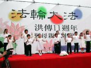 「唱给师父听」莲花开,从天来,我乘莲台为法来。心中记住真善忍,救度众生慈悲怀。小弟子,游四海,随着爸妈正法来。立掌除恶正念起,威力无比天地开。冬已去,春天来,师父带我回家来。宇宙众生在等待,正法圆满师开怀。