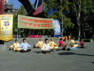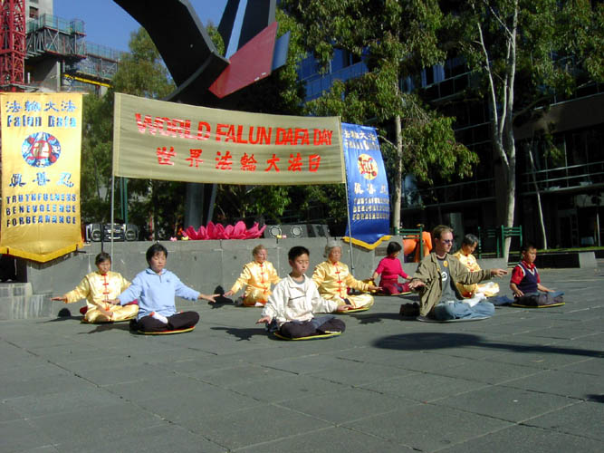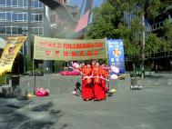 5月10号,星期六,一个阳光明媚的日子,澳大利亚墨尔本法轮大法周在位于市中心的亚若河畔拉开了序幕,学员们身穿鲜艳的中国传统服装,以歌曲、舞蹈、功法演示、图片展览等多种形式来庆祝法轮大法洪传十一周年及世界法轮大法日,人们又从另一个视角看到了法轮大法的美好,有一位老先生从河对岸跑来对我们说:你们真是太美了!