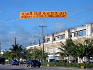 【明慧网2003年5月14日】今年5月13日“世界法轮大法日”,塞班的大法弟子自己制作了两幅20尺长,3尺宽的中英文横幅,在政府相关部门的帮助下,将横幅分别挂在了塞班岛最主要的交通地段,黄底红字的横幅横跨在马路的上空,醒目而耀眼。横幅上用中英文写着:庆祝5.13世界法轮大法日。来来往往的行人与车辆都能看清。