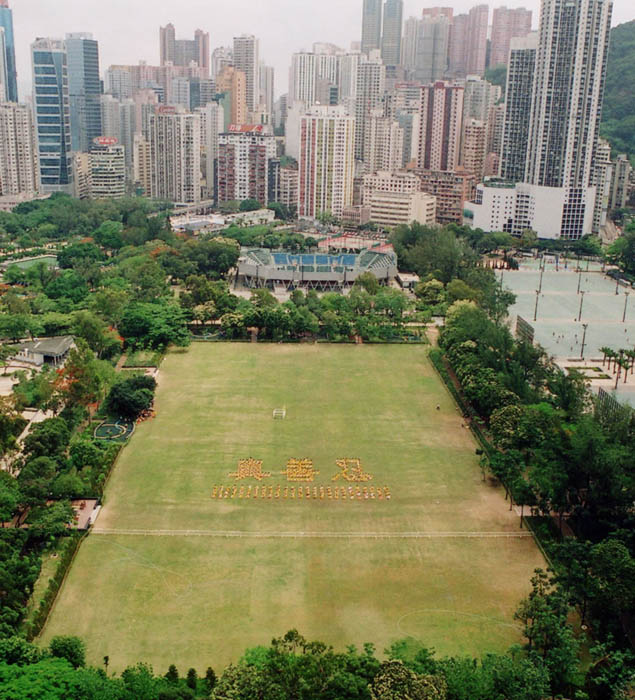 经历了萨斯瘟疫的香港,在5月13日阳光特别明媚。身穿黄衣服的法轮功学员祥和而整齐的炼功动作,吸引了不少人驻足欣赏。